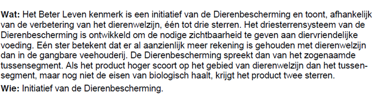 Vrije uitloop voor dieren e.d. Het CPE-keurmerk (www.cpe.nl ), Gras keurmerk en Demeter (www.demeter-bd.nl) stellen hier eisen aan. Nog beter zou het zijn vlees, zuivelproducten en eieren te maken zonder dat er dieren bij nodig zijn. Langzaam is men daar mee bezig. Impossible foods maakt 450.000 hamburgers per maand uit soja-legeiwit en kreeg van Bill Gates 73 miljoen om de productie op te schale Memphis meat tracht vlees te kweken uit cellen van varkens, kippen en runderen. Het is nog duur en experimenteel maar het zou een hoop leed bij dieren voorkomen.