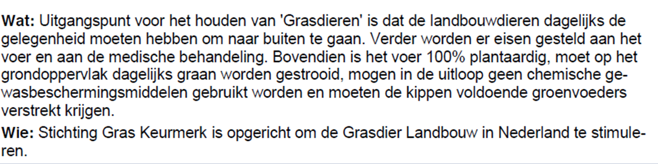 Daarnaast worden dieren onder zo natuurlijk mogelijke omstandigheden gehouden, ook wat hun voeding betreft. Verder worden geen genetisch gemodificeerde organismen toegepast.