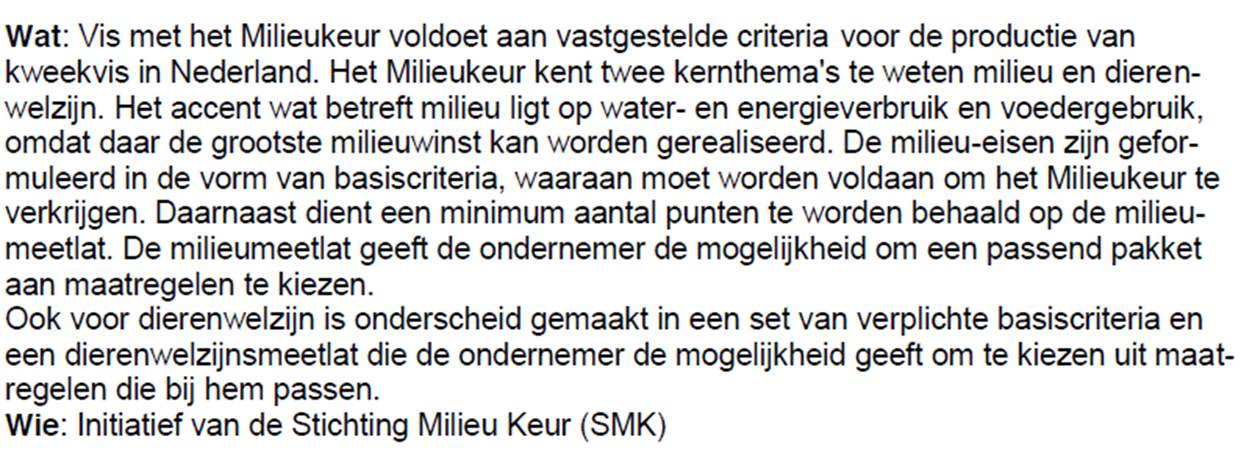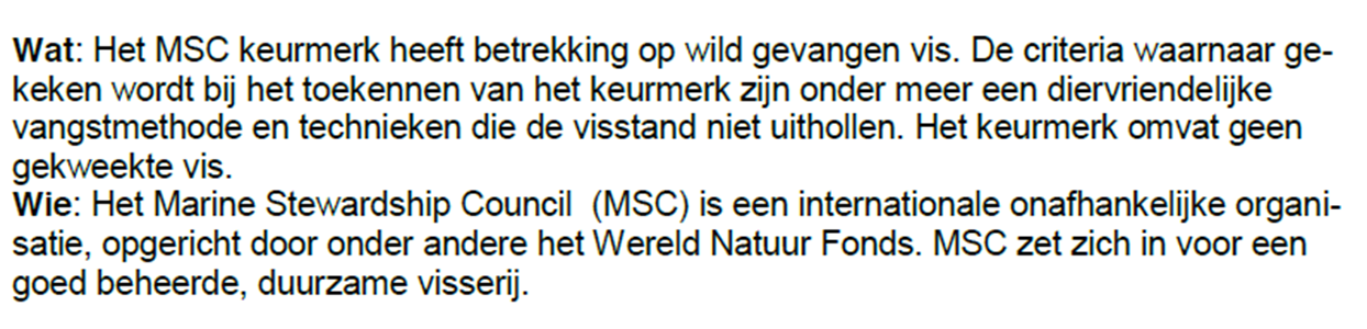 Vissen moeten op duurzame wijze gevangen of gekweekt worden. Hiervoor geven het Marine Stewardship council (MSC; www.msc.org) en de groene of gele kleur op WNF-viswijzer (www.wnf.nl) handvatten.