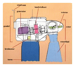 De belangrijkste onderdelen van de windturbine zijn de rotor, de gondel, de tandwielkast, de generator (grote dynamo) en de toren. De rotor van de windturbine kan bestaan uit één, twee of drie bladen. Hoe minder bladen des te sneller zal de windturbine draaien op het moment dat de rotor in de wind wordt gedraaid. De windvaan geeft een signaal aan de kruimotor en zo zorgen ze er beiden voor dat de windturbine optimaal in de wind wordt gedraaid. De rotor gaat vervolgens door de wind draaien en drijft een generator aan, die elektriciteit opwekt die voor eigen gebruik kan dienen of kan worden teruggeleverd aan een energiedistributiebedrijf.